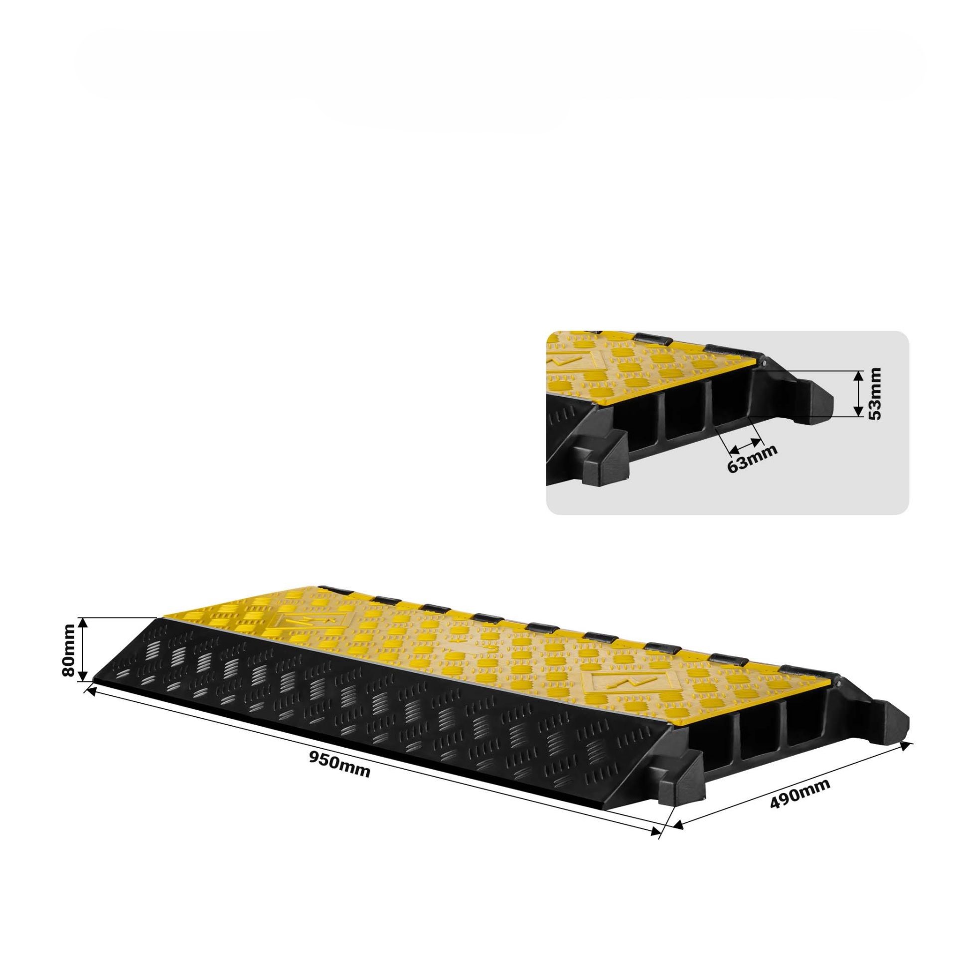 Povozni, zaščitni prag za kable in cevi je opremljen s kanali dimenzije 63 x 53 mm. Povozni zaščitni pragovi se namestijo neposredno na cestišče, ne zahtevajo posebne priprave terena.